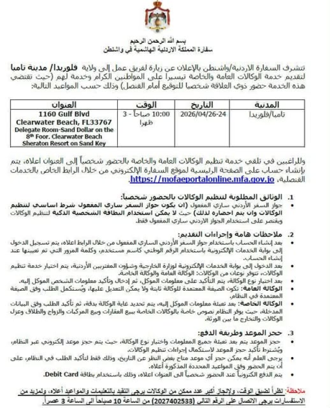 خبرني - أعلنت السفارة الأردنية في واشنطن عن تنظيم زيارة لفريق قنصلي إلى ولاية فلوريدا / مدينة تامبا، بهدف تقديم خدمات الوكالات العامة والخاصة للمواطنين الأردنيين.