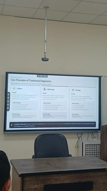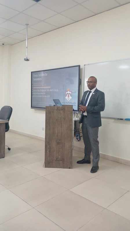 وتناول الأستاذ أبو غليون خلال المحاضرة أحدث أساليب تشخيص الأمراض السارية، مع التركيز على تقنية تفاعل الحمض النووي (PCR) بمختلف أنواعها وتطبيقاتها في المجالين البحثي والتشخيصي، مقدماً شرحًا علميًا لمفهوم الأمراض السارية وآليات انتقالها، والعوامل المؤثرة في انتشارها داخل المجتمعات، وتضمنت المحاضرة التطور الحاصل في تقنيات التشخيص المخبري الحديثة، ودور التقنيات الجزيئية في رفع دقة وسرعة الكشف عن المسببات المرضية، وأهميتها في دعم الجهود الصحية الوطنية ومكافحة الأوبئة.