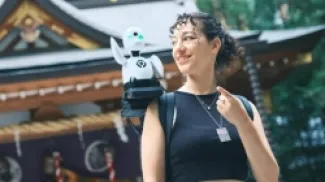 روبوت صغير على الكتف يوجه السائحين في جولة حول طوكيو