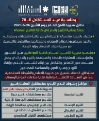الأمن العام يطلق يوم الاثنين 26-5-2025 حملة وطنية للتبرع بالدم بكافة اقاليم المملكة